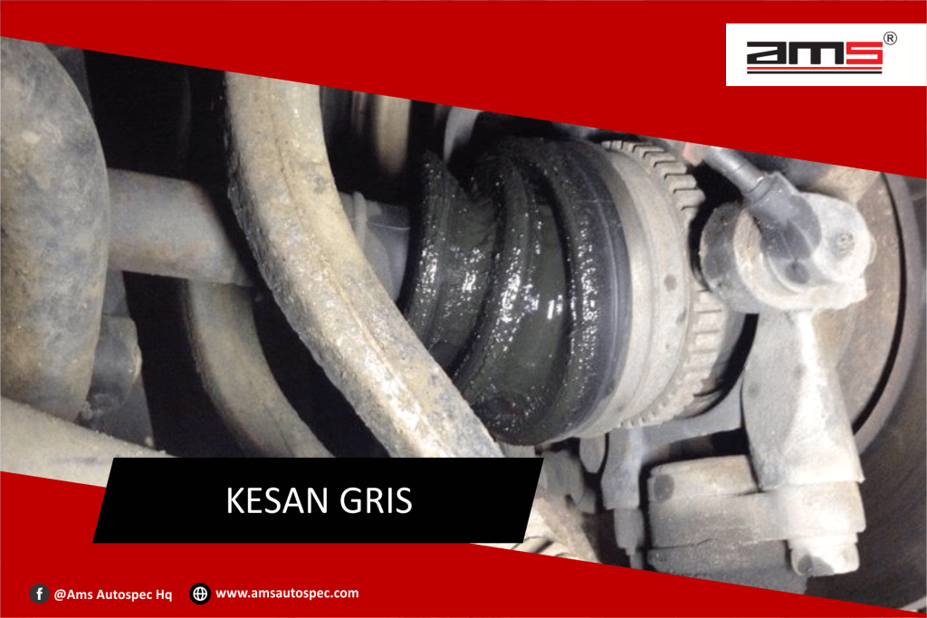 Jika terdapat kesan gris pada tayar atau permukaan lower arm, itu merupan juga tanda di mana CV boot mungkin koyak.